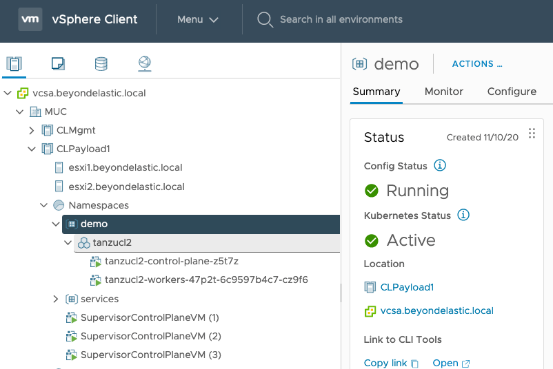 In my case, I have the vSphere Supervisor Cluster already activated and a TKG cluster “tanzucl2” provisioned in the demo namespace.