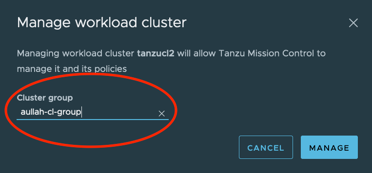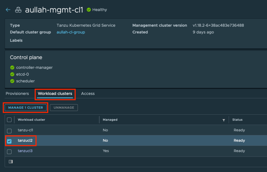 We can put existing TKG clusters under the management of TMC. In my case, I already have some TKG clusters on vSphere, which were provisioned via the Supervisor Cluster. I have to go to the “Workload clusters” tab, select the TKG cluster that I want to add, and click on “Manage 1 Cluster”.