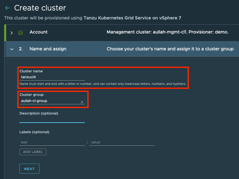 We will then specify a name for the TKG cluster we want to create and select a TMC cluster group in which the cluster should be placed.