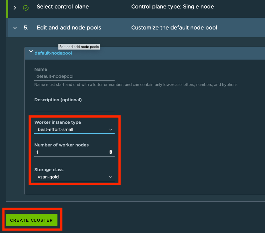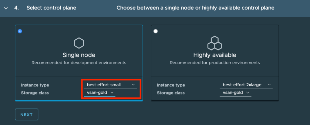 In step 4, we will select if we want a single node control plane or a highly available control plane with three nodes. Additionally, we can choose the Instance type and storage class. You select which Virtual Machine Class (CPU, Memory, non-reserved, reserved) will be used with the Instance type. You can find the definitions of Virtual Machine classes here.