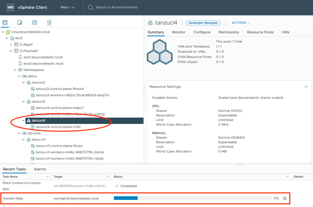This process will take some time as TKG node VMs are being cloned from your vSphere Content Library’s available images.