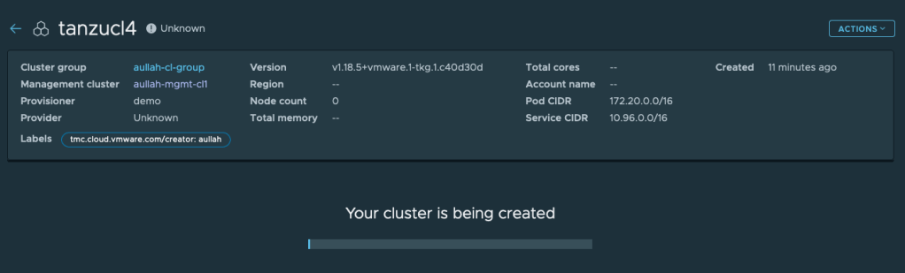 ➜ ~ tmc cluster create -t tkgs --name tanzucl5 -m aullah-mgmt-cl1 -p demo --cluster-group aullah-cl-group --version "v1.18.5+vmware.1-tkg.1.c40d30d" --storage-class vsan-gold --allowed-storage-classes vsan-gold --default-storage-class vsan-gold --instance-type best-effort-small --worker-instance-type best-effort-small