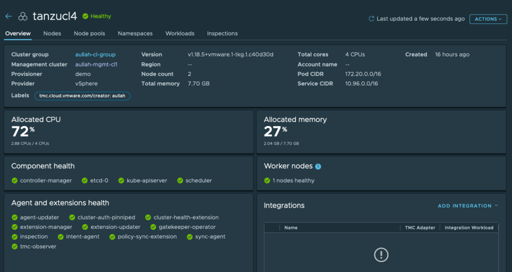 The TMC agents will be installed in the background, and soon we will see the TKG cluster showing up under the Clusters view of TMC.