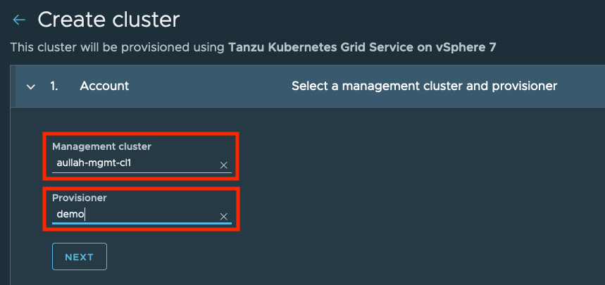During the first step, we need to select the Management cluster, which we have registered earlier. Additionally, we need to choose the Provisioner (Namespace) in which we want to deploy our TKG cluster.