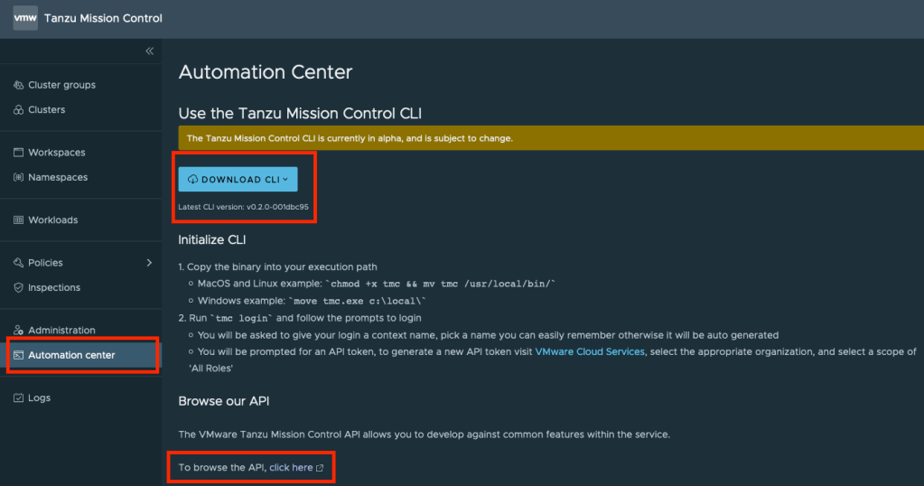 - Tanzu Mission Control API reference
