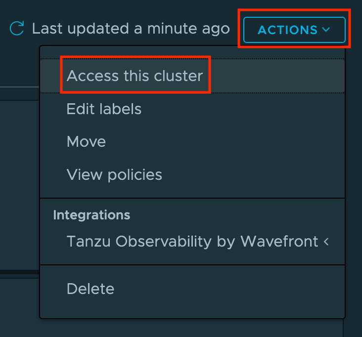 To access our TMC managed TKG clusters, we can either use the TMC console or the TMC CLI to download the kubeconfig file. Within the TMC console, we can click on “ACTIONS” and “Access this cluster”.